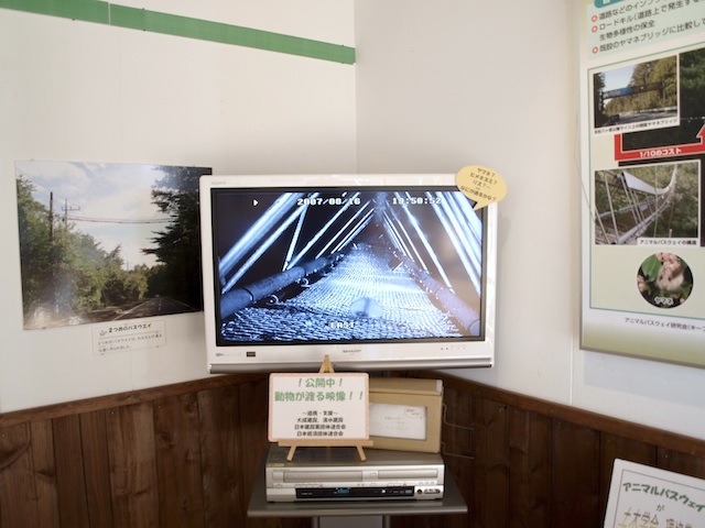 橋の隣に設置した柱にビデオカメラを設置し、日中はカラーで昼行性動物を、夜間はモノクロ赤外線撮影で夜行性の動物を記録しました。HDDレコーダは現地の電工BOX内に設置しました。